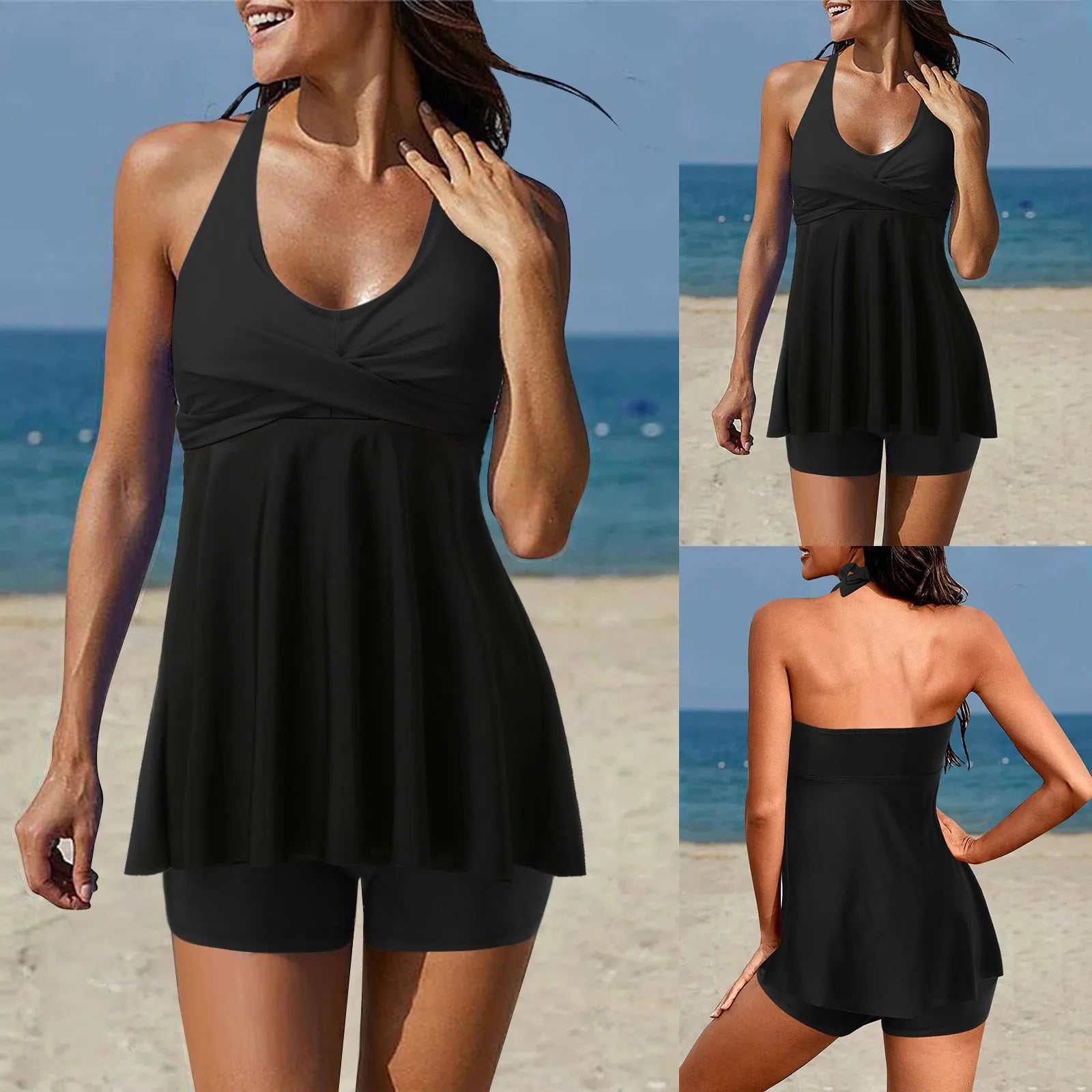 2 piece tankini bathing suits for women: Swim top + boy shorts bottom. Tankini tops with halter V neck offer support and shape.