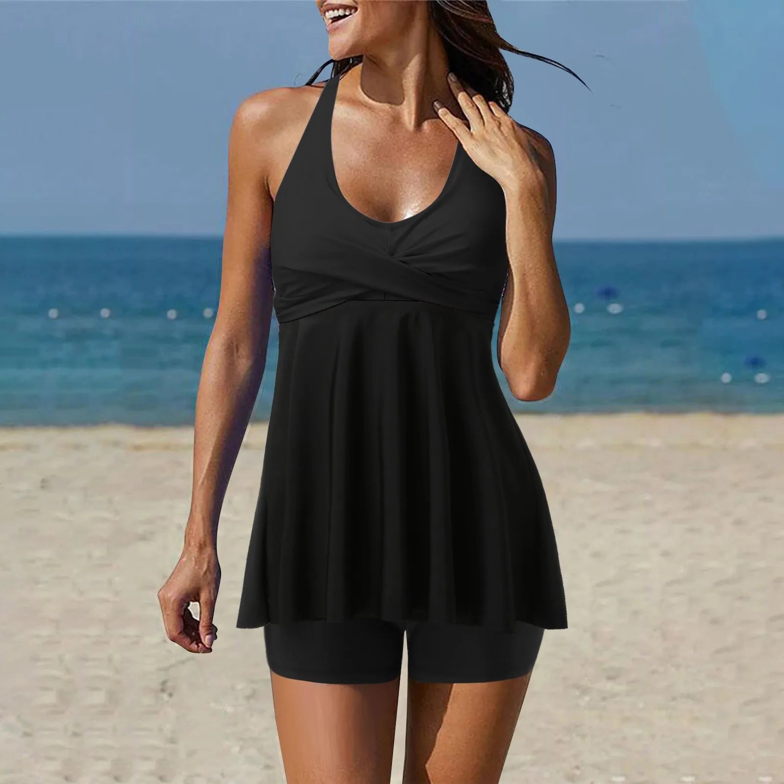 Two Piece Tankini Swimsuits For Women With Shorts Halter V Neck Bathing Suits Flowy Twist Front Swimwear