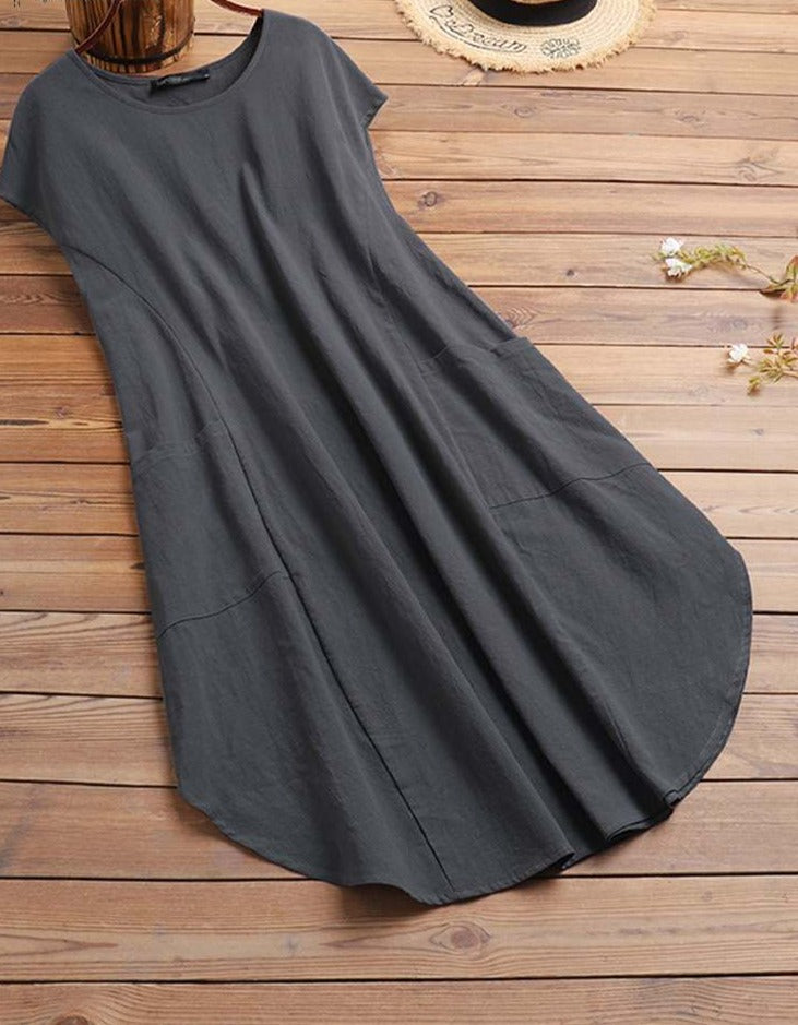שמלת אוברסייז רחבה הנשפכת על הגוף בעיצוב מהמם ומחמיא מעוטר כיסי צד אלגנטיים בקו נקי