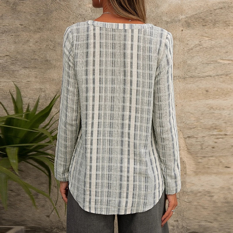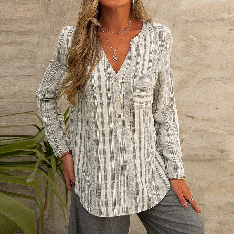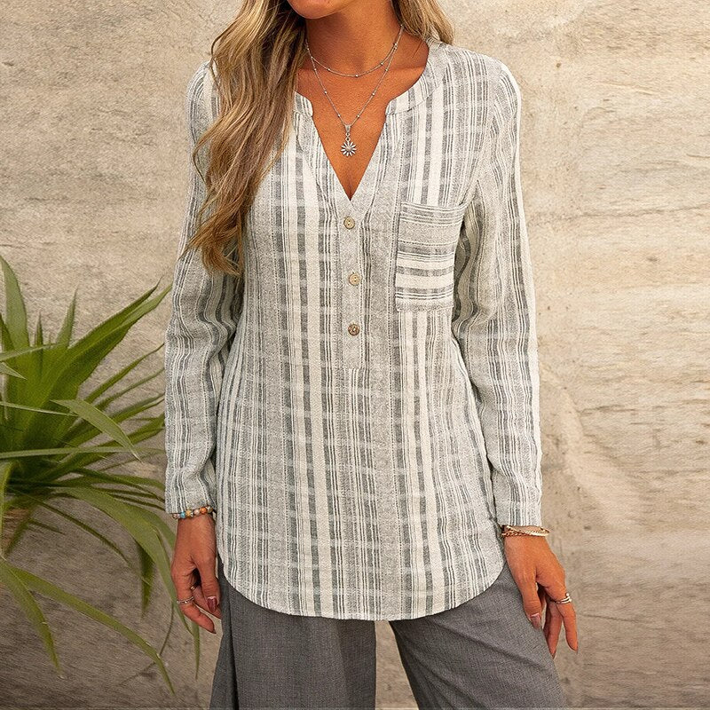 חולצת בוהו-שיק מסוגננת בגזרה נוחה במיוחד עם כיס קידמי כפתורים בחזית וצווארון צרפתי מהמם