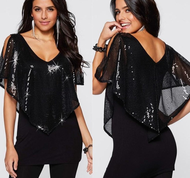 הפריט שיכניס זוהר לארון שלך - חולצת ערב מושלמת וזוהרת עם פאייטים אול אובר, כתף חשופה ושרוול ענן נשפך עם בטנה פנימית מבד נעים ואיכותי
