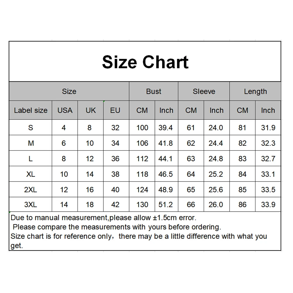 [Our Size 2XL] Bust: 124cm/48.82", Length: 85cm/33.46", Sleeve: 65cm/25.59" (Approx.)