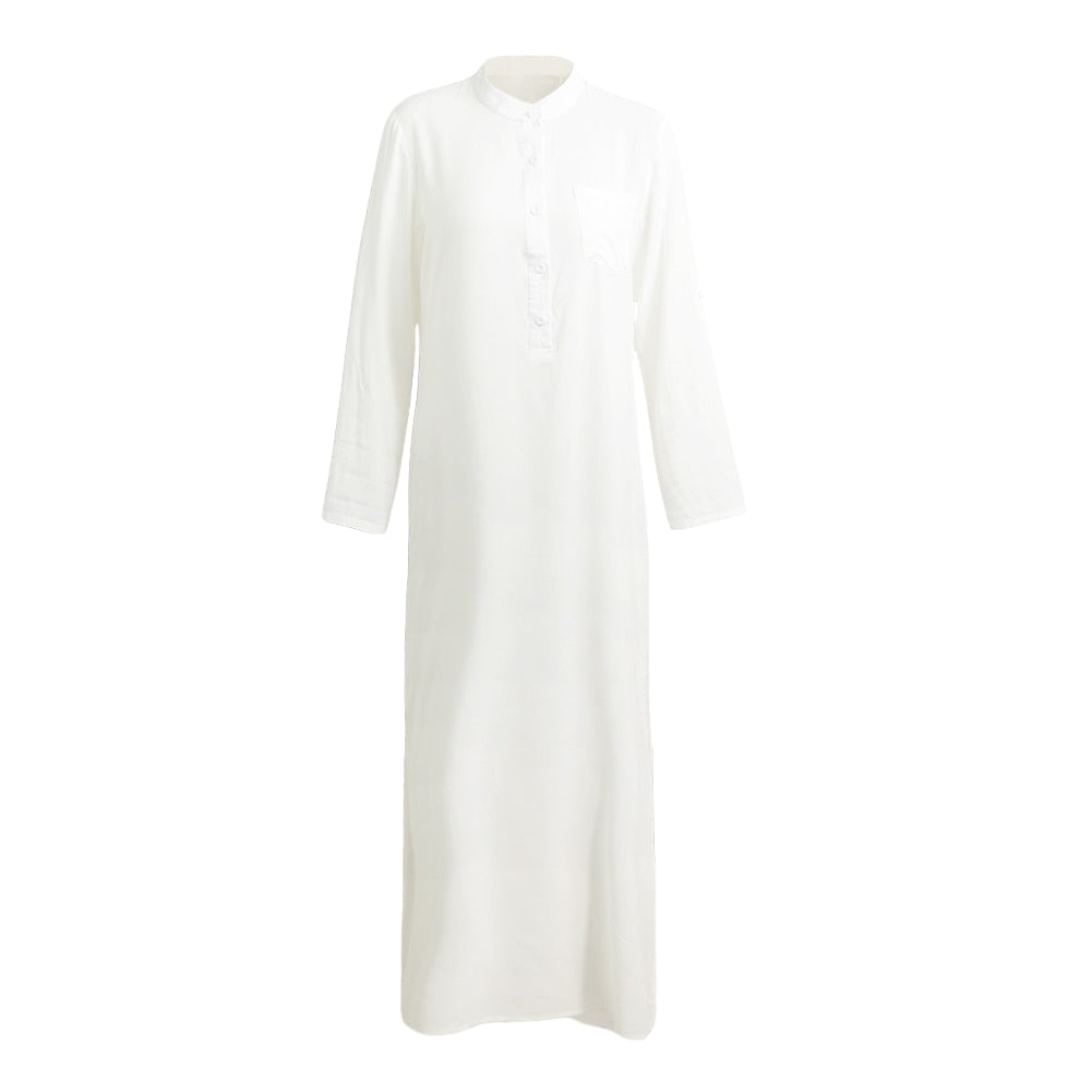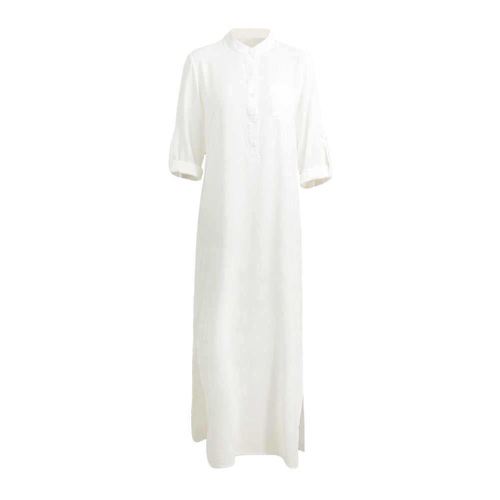שמלת מקסי קלאסית מהממת בעיצוב חלק ונעים אם צווארון וי ורכיסת כפתורים ושרוולי 3/4