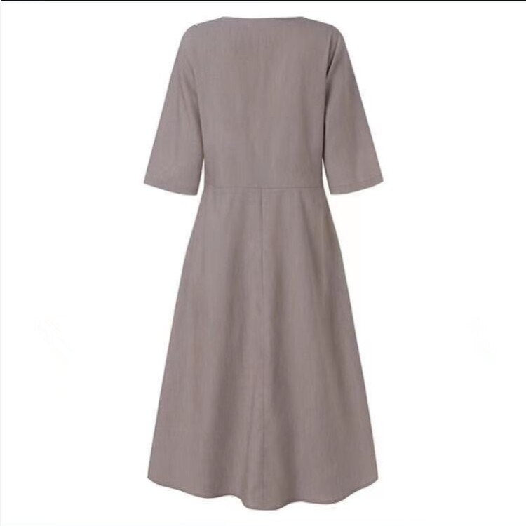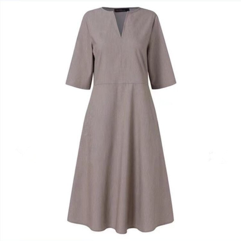 שמלת מידי קלאסית עם צווארון וי מעודן צרפתי, צמד כיסים צדדיים נוחים במיוחד עם שרוולי עטלף נשפכים, גזרת אוברסייז נשפכת על הגוף מבד נעים ומלטף