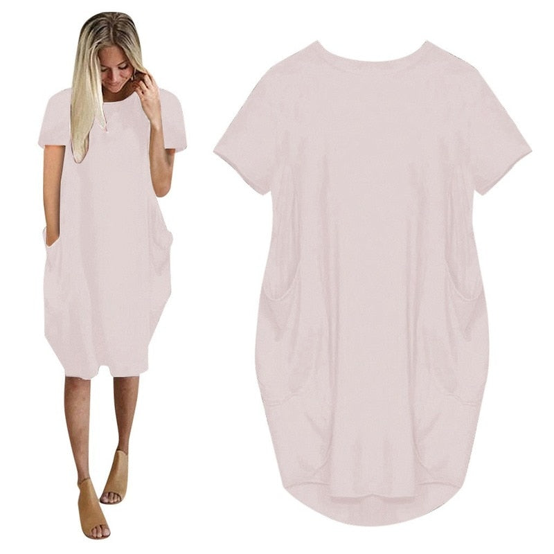 שמלת אוברסייז בגזרה נשפכת על הגוף מלווה בכיסי צד המגיעה במגוון צבעים הורסים